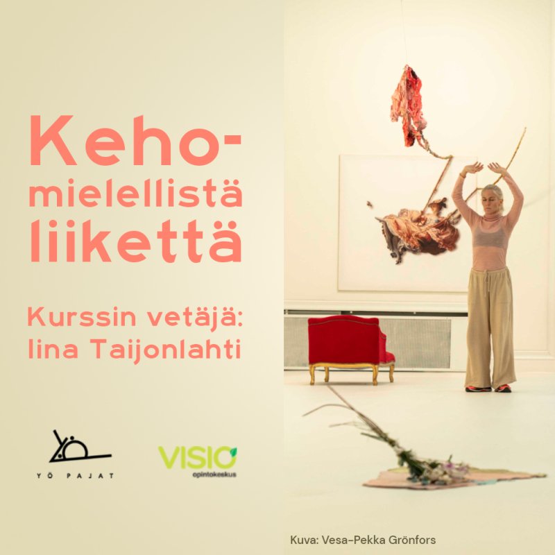 Kurssilla rakennamme helppojen liikkeelisten harjoitteiden kautta yhteyttä omaan kehoon sekä muiden kehoihin. Kurssilla tehdään keho-mielellisiä harjoitteita, jotka pohjaavat muun muassa nykytanssiin, kontakti-improvisaatioon, qigongiin, biomekaniikkaan sekä polyvagaaliseen teoriaan. Tutkimme näiden harjoitteiden kautta muun muassa katseen ja liikkeen yhteyttä. Ammennamme inspiraatiota myös Yö Gallerian sen hetkisestä näyttelystä.